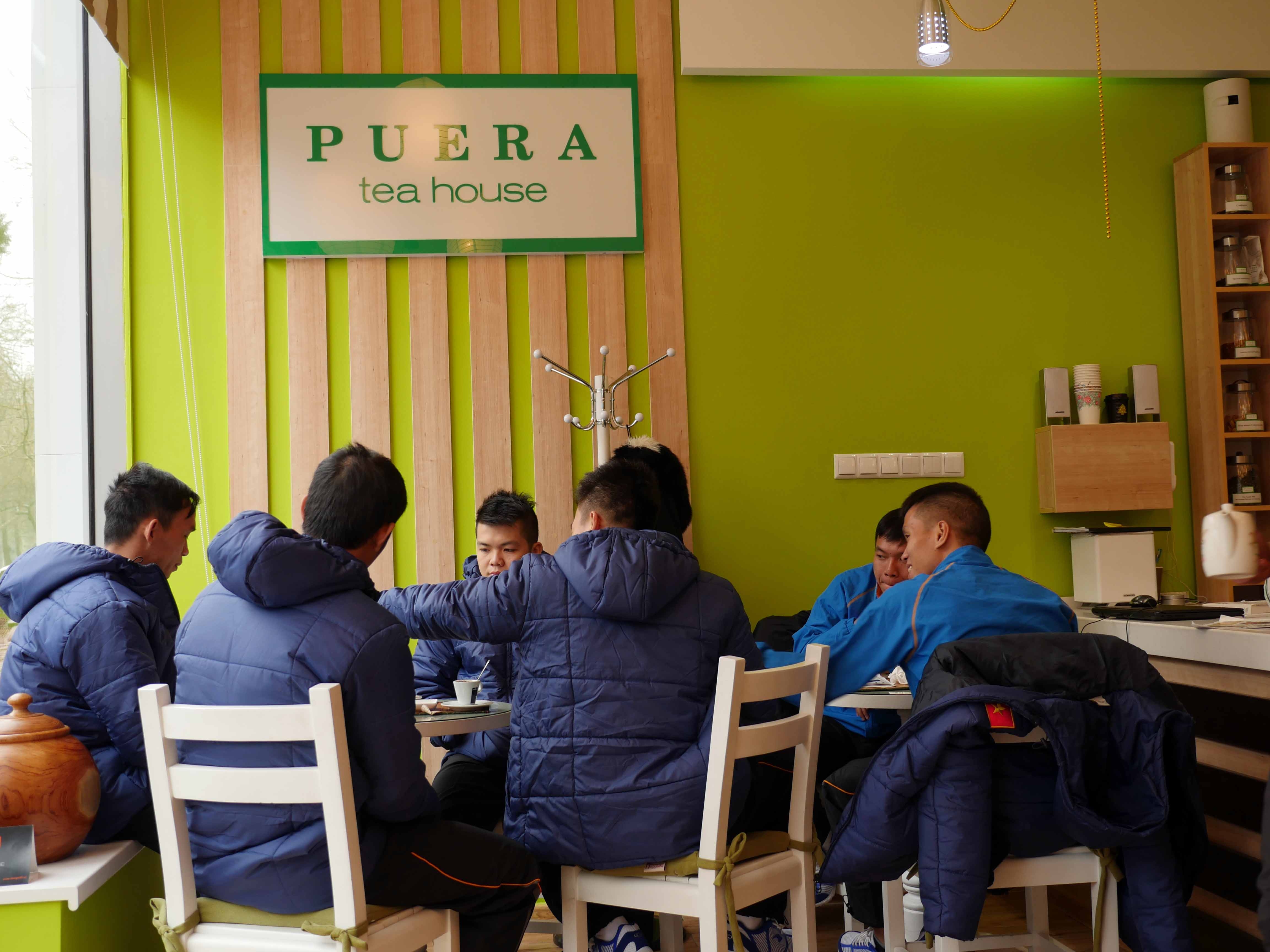 | Một quán trà đạo nhỏ nhắn là địa điểm được các tuyển thụ chọn để dừng chân. Họ nhâm nhi một tách trà hoặc ca cao nóng để chống lại cái lạnh cắt da, cắt thịt tại quốc gia Trung Á này. Đây cũng là cách để mọi người trong đội hiểu nhau hơn, chia sẻ nhau những câu chuyện buồn vui khi phải xa nhà đúng dịp Tết vì nhiệm vụ quốc gia. |