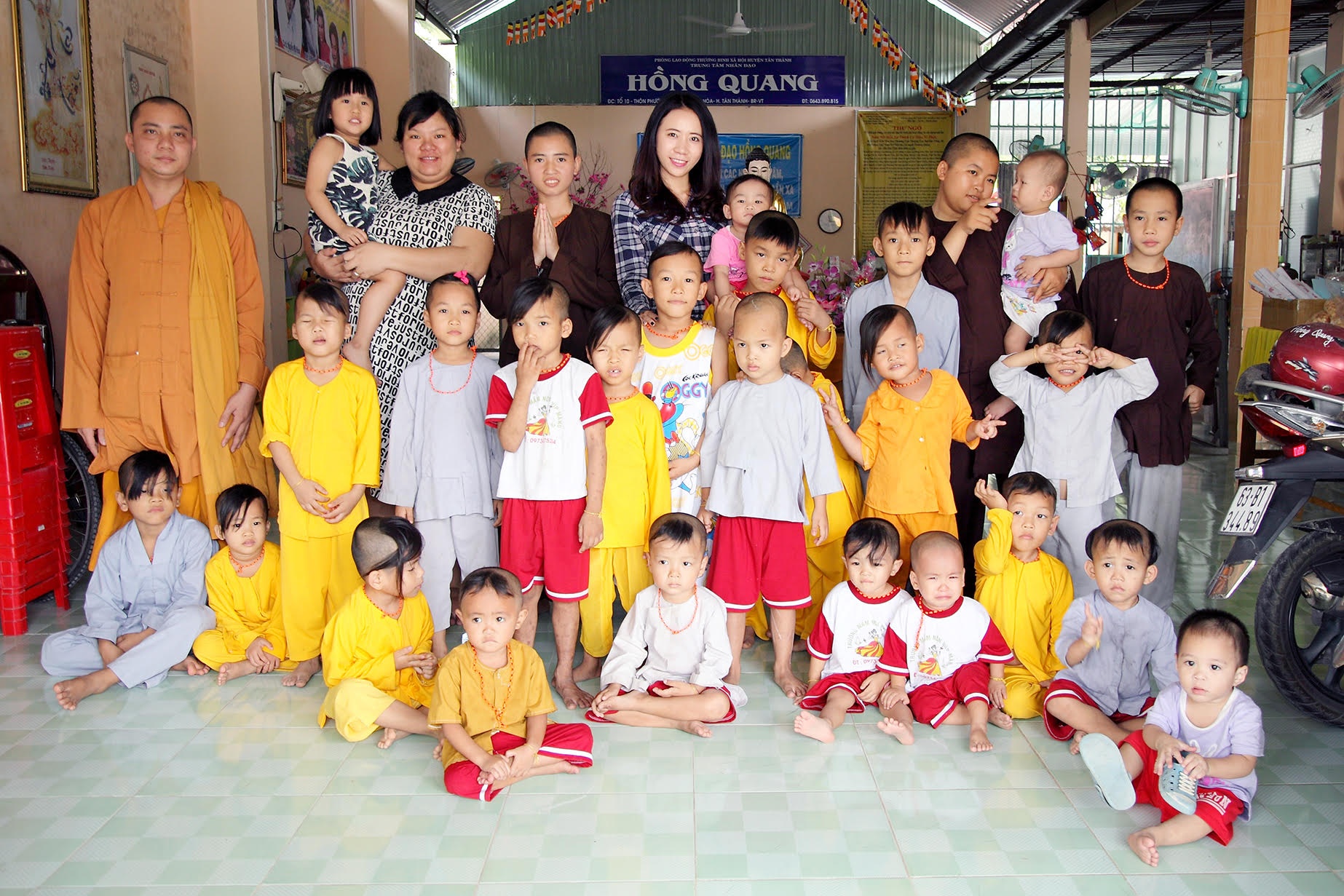 | Tuyền Mập chụp hình kỷ niệm với các em nhỏ và sư thầy của mái ấm Hồng Quang. Chị chia sẻ: "Làm được việc nhỏ nhưng bản thân lại có niềm vui lớn". |