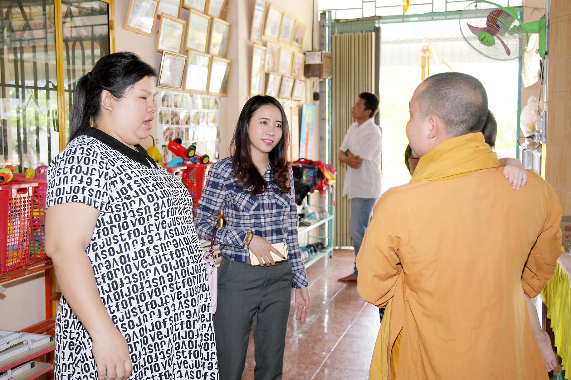 | Tuyền Mập trò chuyện cùng sư trụ trì mái ấm Hồng Quang. Cô hứa, sau khi con cứng cáp, sẽ đưa con đến đây tặng quà cho các bạn nhỏ. |