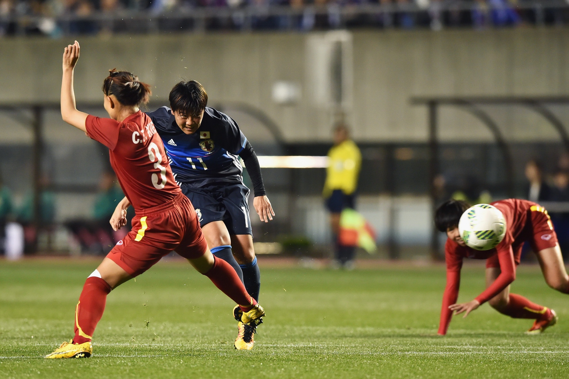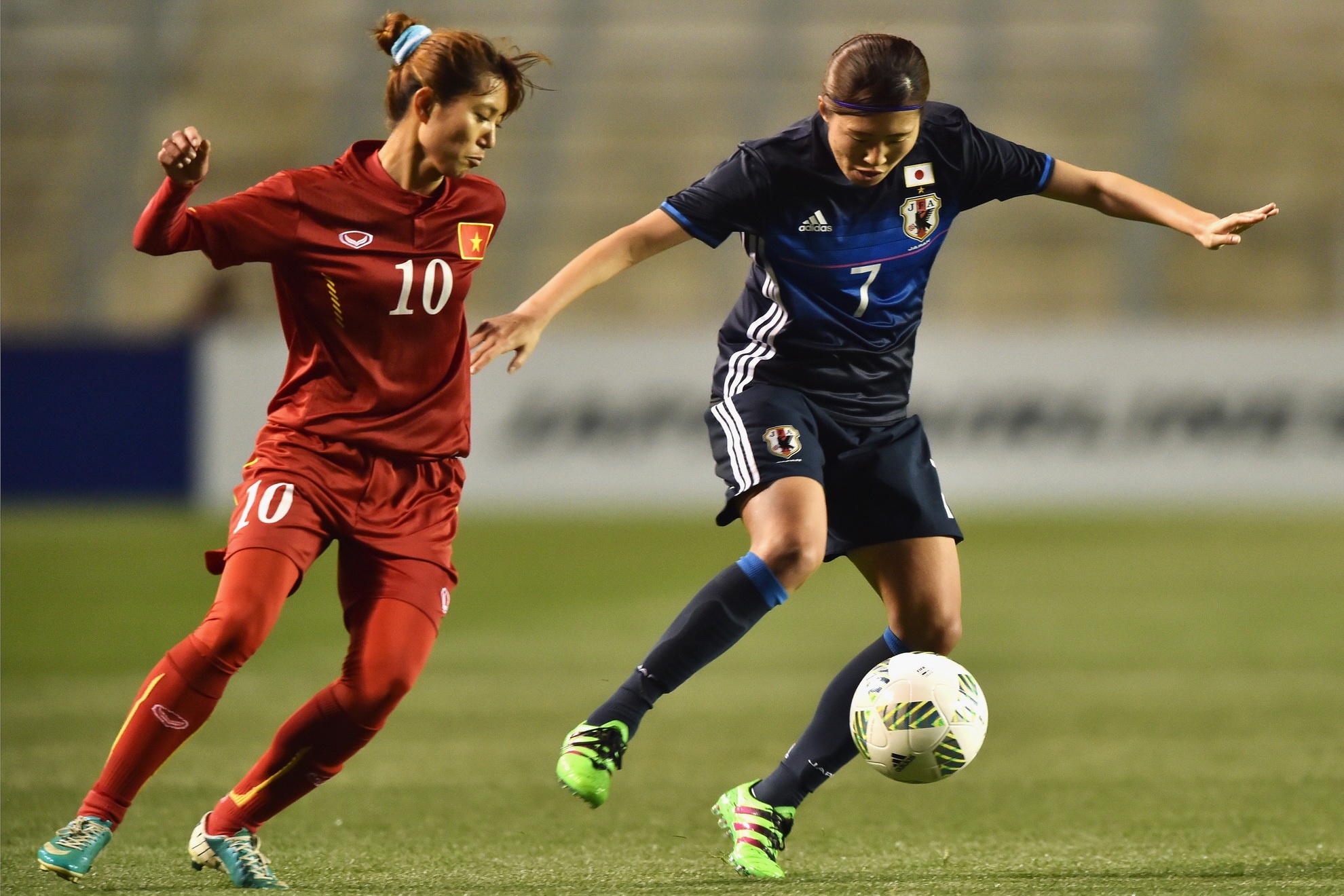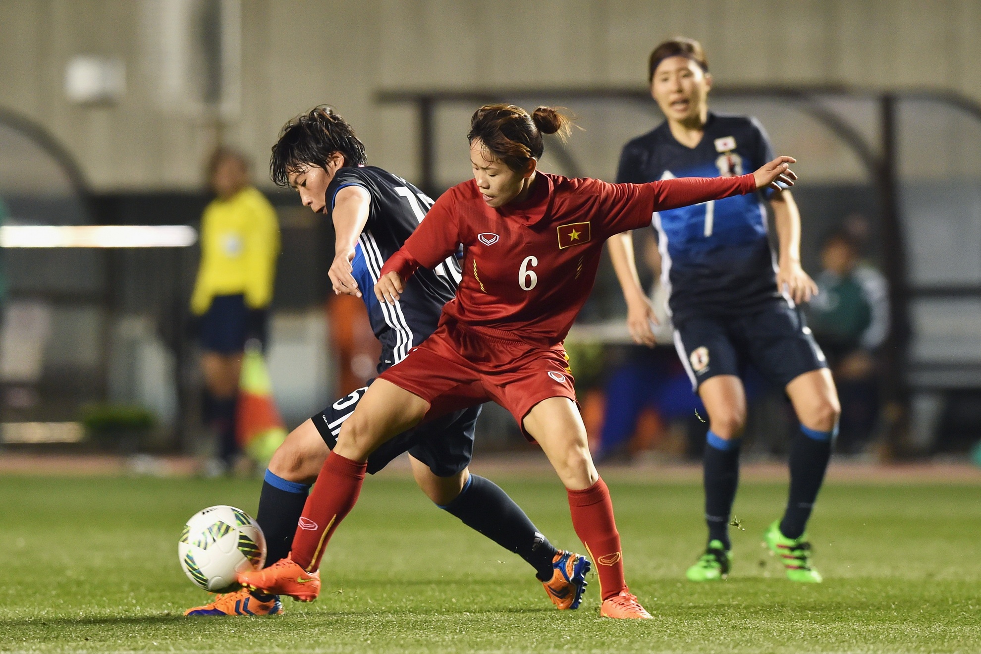 | Tuyển nữ Việt Nam để thua trước ở phút 39, sau sút đẹp mặt của cầu thủ Mana Iwabuchi. Tuy nhiên chỉ 3 phút sau, tiền vệ Nguyễn Thị Hòa (10) có tình huống đột phá dũng mãnh xâm nhập vòng cấm, khiến hậu vệ Nhật Bản phải phạm lỗi. Trọng tài chính lập tức thổi còi cho tuyển nữ Việt Nam hưởng quả phạt 11 m. |