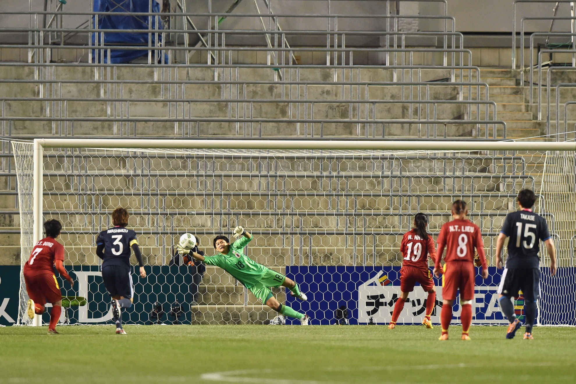 | Ở tình huống sút phạt đền, thủ môn Nhật Bản đã đoán đúng hướng bóng nhưng không thể cản phá cú dứt điểm quyết đoán của tiền đạo Huỳnh Như. |