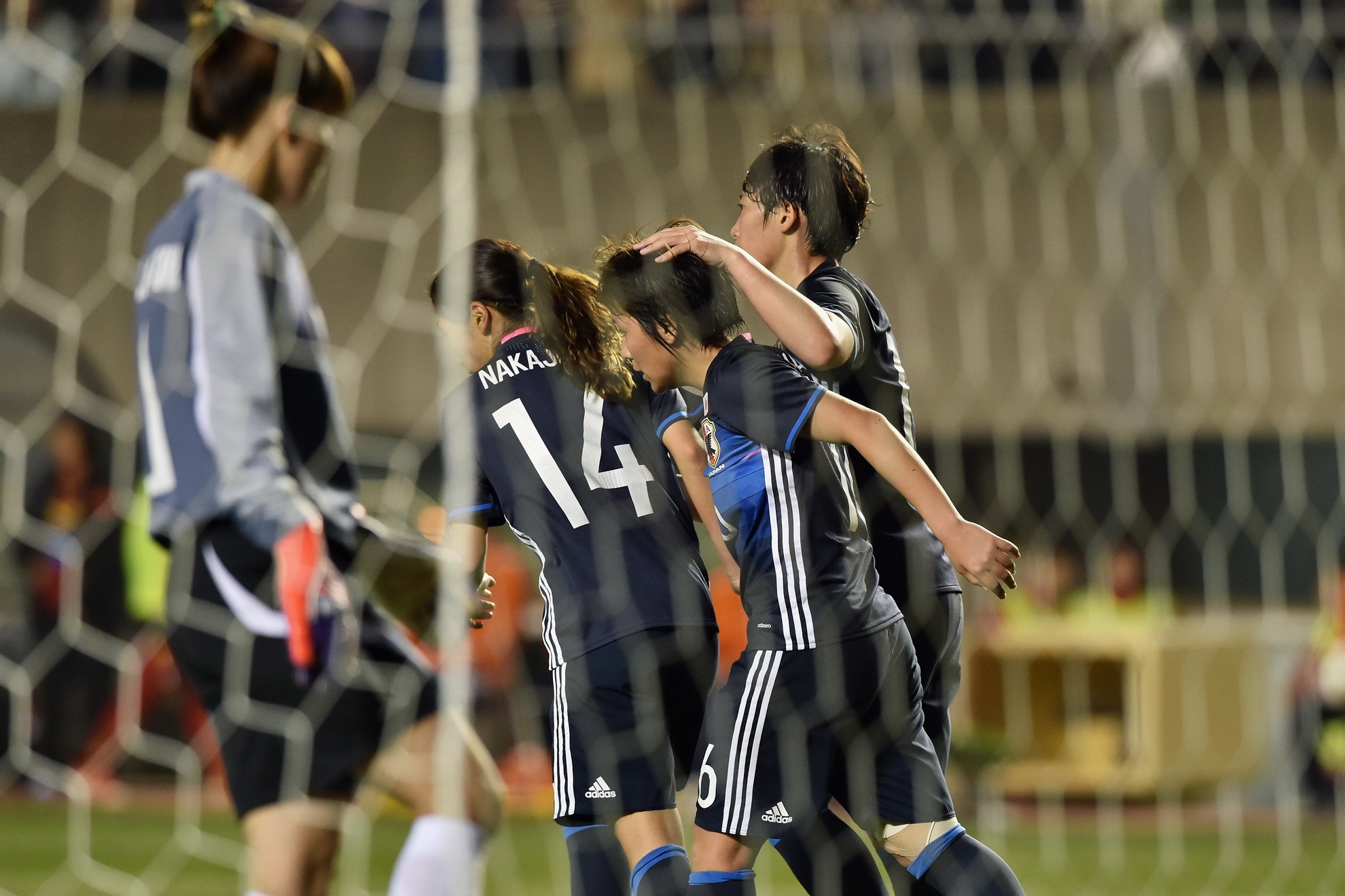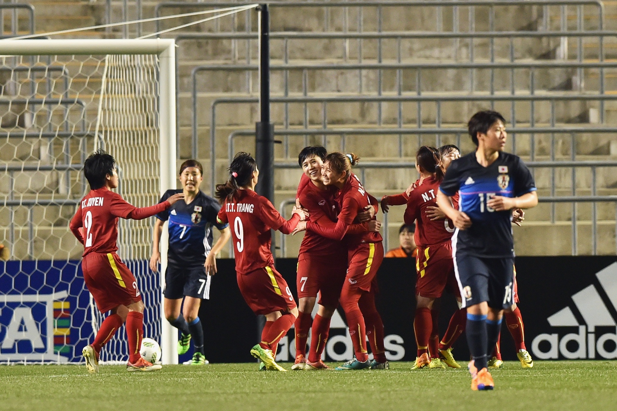 | Cầu thủ Việt Nam ăn mừng sau khi san bằng tỷ số 1-1 trước Nhật Bản. Đây cũng là bàn thắng đầu tiên trong lịch sử mà đội tuyển nữ Việt Nam ghi được vào lưới đội bóng hàng đầu thế giới. |