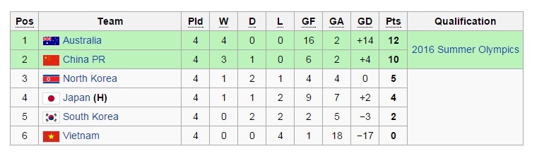 | Bảng xếp hạng sau lượt trận thứ 3, Vòng loại cuối cùng Olympic 2016, khu vực châu Á. |