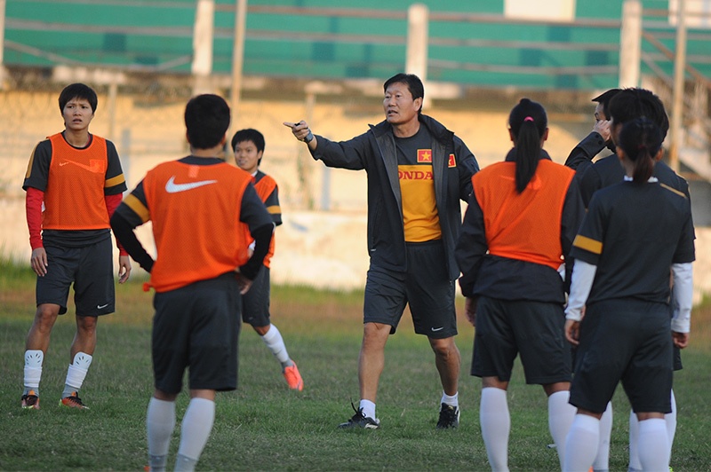 | Trong buổi tập cuối cùng trước trận chung kết, ông cho đội tuyển nữ Việt Nam khởi động nhẹ... |