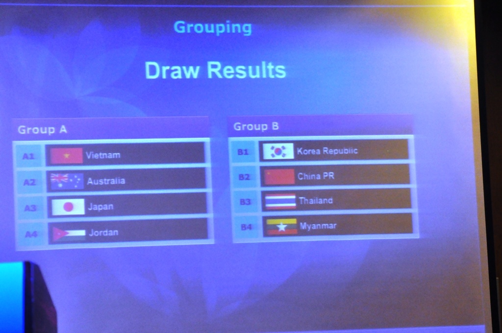 Kết quả, tuyển Việt Nam nằm cùng bảng với Australia (ĐKVĐ châu Á), Nhật Bản- ĐKVĐ thế giới và Jordan. Bảng B sẽ là cuộc tranh tài của 4 đội: Hàn Quốc, Trung Quốc, Myanmar và Thái Lan.