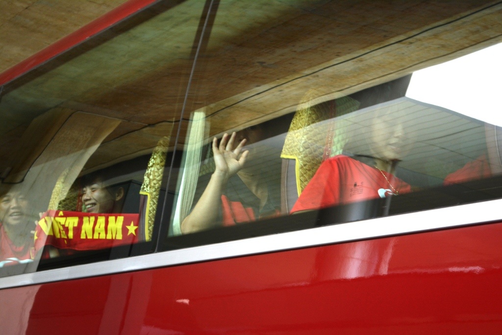 | Tuyển thủ Kim Hồng cười tươi với tấm băng rôn được người hâm mộ tặng khi lên xe. |