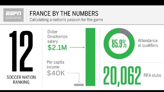 | Những con số nói lên mức độ quan tâm của người dân Pháp với đội tuyển, mức thu nhập của HLV Deschamps so với bình quân người Pháp. |