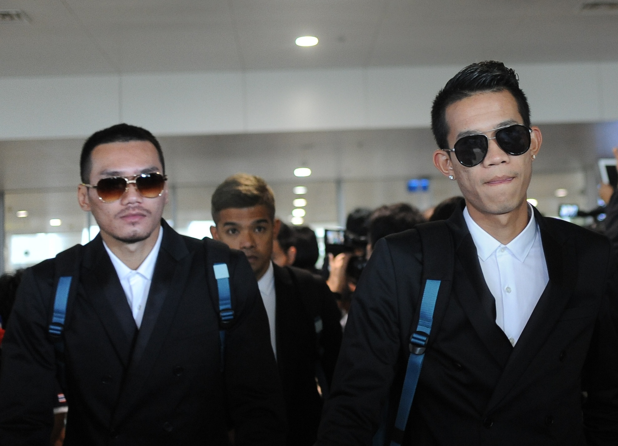 | Tuyển thủ Thái Lan xuất hiện với bộ vest đen lịch lãm và đeo kính tối màu, họ không sử dụng trang phục thể thao như trước đây. |