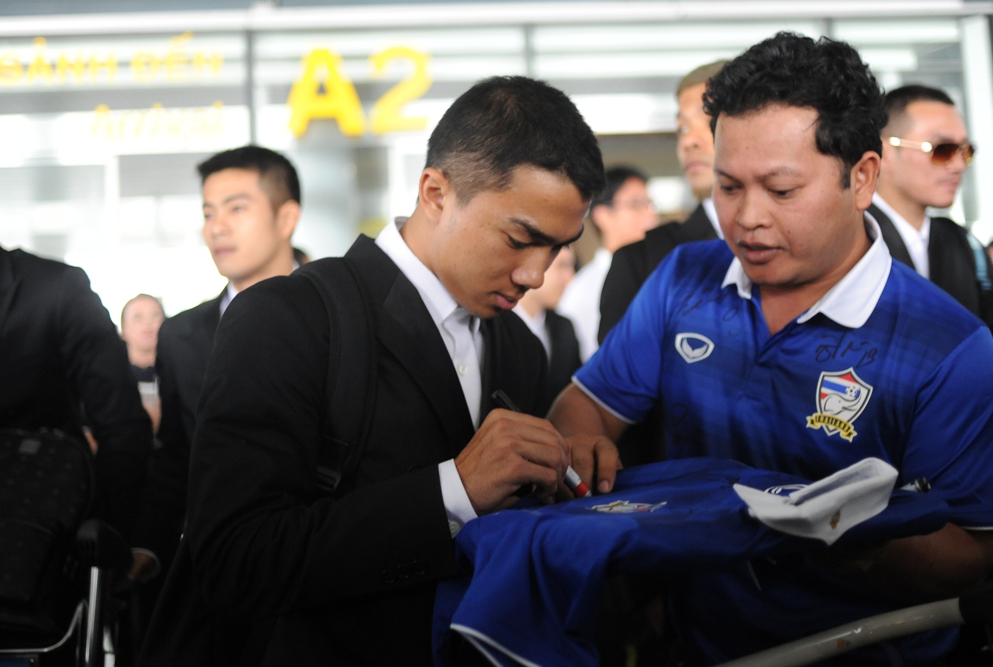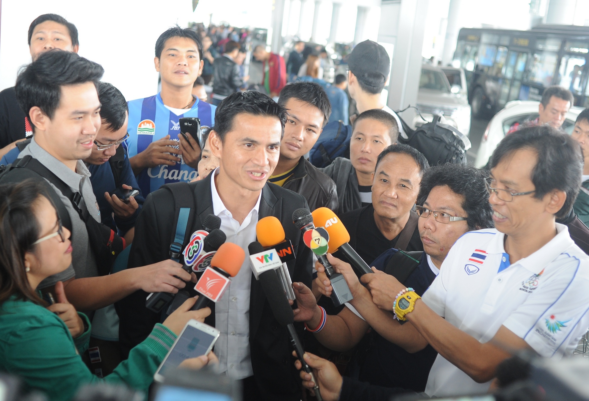| Sau khoảng 45 phút làm thủ tục nhập cảnh và lấy hành lý, HLV trưởng Kiatisak dẫn đầu đoàn Thái Lan bước ra từ sảnh đến quốc tế. Ông nhận được sự đón tiếp nồng nhiệt từ người hâm mộ và truyền thông Thái Lan. Vừa có mặt tại sân bay, Kiatisak nói muốn chạm trán với tất cả cầu thủ Việt Nam chứ không chỉ riêng cặp đôi được truyền thông Thái Lan nhắc đến gần đây là Công Vinh và Công Phượng. |