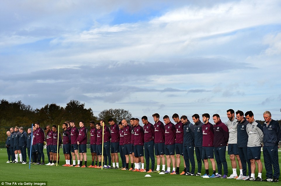 | Trong buổi tập ngày 16/11 tại trung tâm huấn luyện của Tottenham, 21 cầu thủ cùng thành viên ban huấn luyện tuyển Anh dành một phút mặc niệm các nạn nhân trong vụ khủng bố tại Pháp hôm 13/11 khiến 129 người thiệt mạng. |