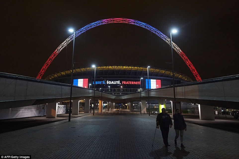 | Hệ thống ánh sáng ở sân Wembley sẽ được trang trí ba màu chủ đạo xanh, trắng, đỏ tượng trưng cho màu cờ Pháp. Ban tổ chức sân muốn chia sẻ nỗi đau với người dân Pháp sau vụ khủng bố ngày 13/11. |