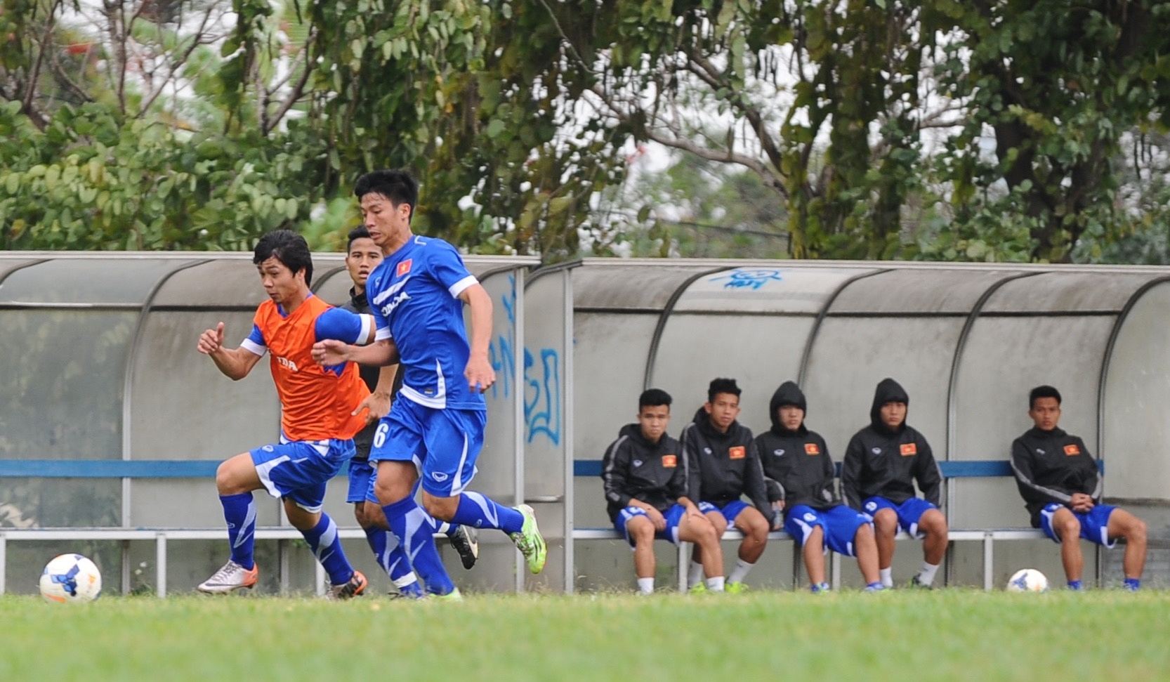 | Sau khi hoàn thành xong giáo án tập nhẹ để hồi phục, 5 cầu thủ chấn thương gồm Thanh Tùng, Hồng Duy, Xuân Trường, Tuấn Tài và Ngọc Thắng ngồi nhìn các đồng đội thi đấu đối kháng trong buổi tập sáng ngày 1/3. |
