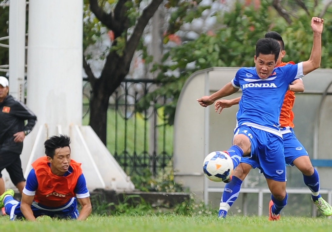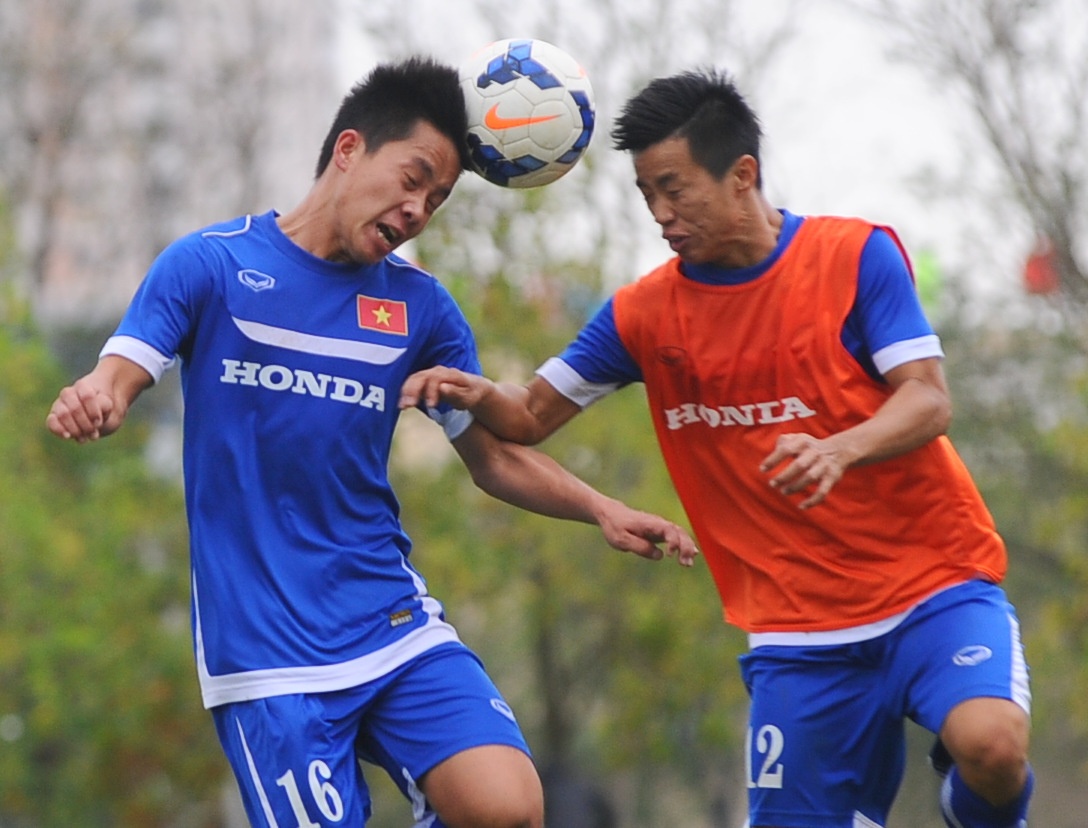 | Tiền đạo trẻ Lê Thanh Bình (phải) gây ấn tượng mạnh trong buổi tập sáng nay với những cú sút uy lực từ cả trong và ngoài vòng cấm. |