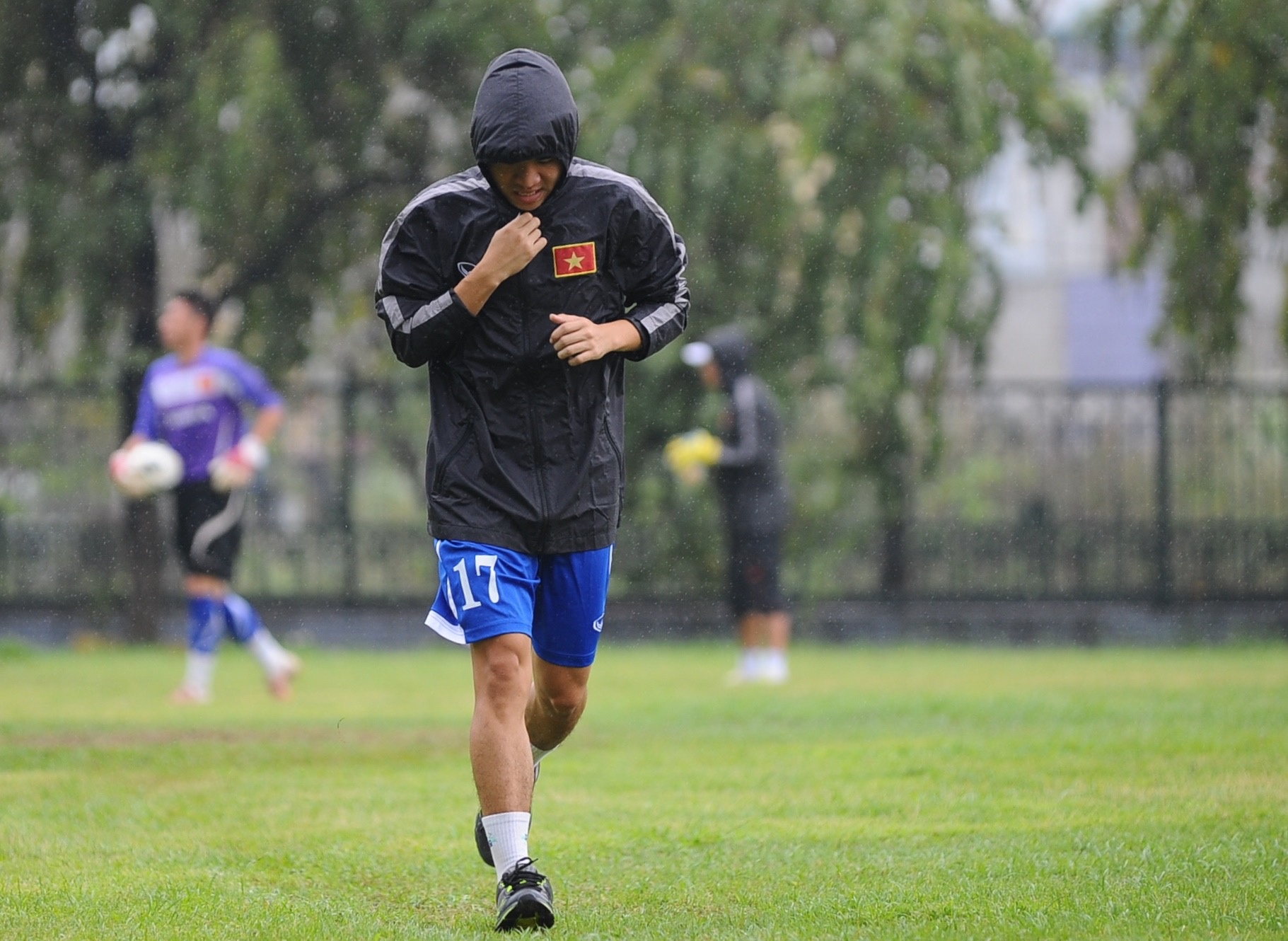 | Mặc trời mưa kèm gió rét, tiền vệ Thanh Tùng (HAGL) vẫn tham gia buổi tập bằng cách chạy nhẹ để kích thích các nhóm cơ bị tổn thương sớm hồi phục. |