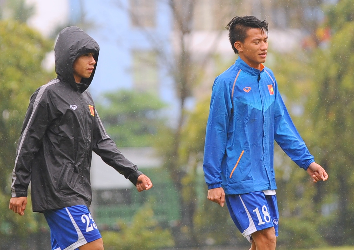 Buổi tập sáng nay của Olympic Việt Nam diễn ra dưới trời mưa nhỏ kèm gió rét, toàn đội nỗ lực tập luyện dưới sự giám sát nghiêm khắc của HLV người Nhật Bản.