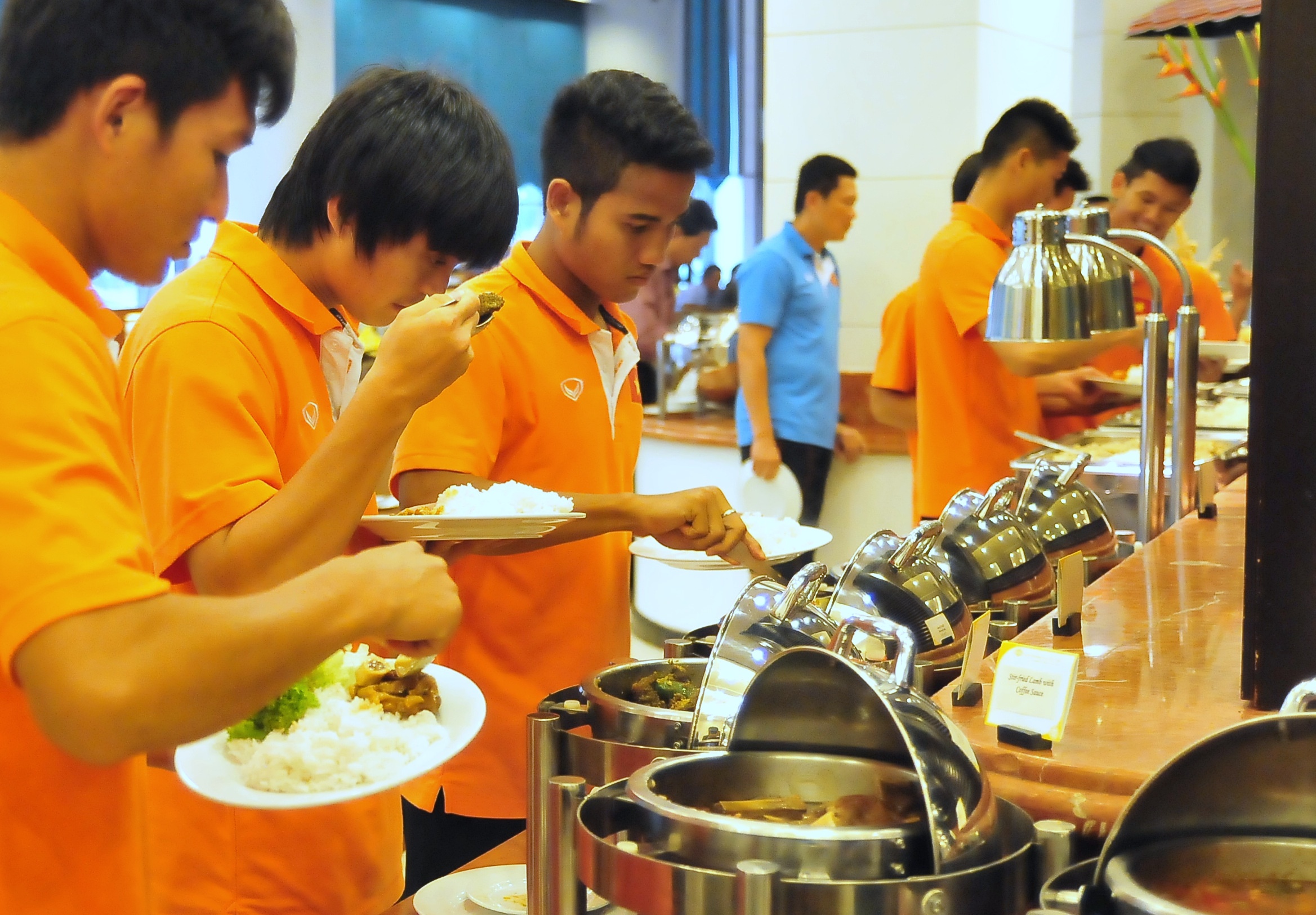 | Hàng ngày, ĐT Olympic Việt Nam được bố trí 3 bữa buffet tại Grand Bluewave. Khách sạn 4 sao này nằm trong khu vực đạo Hồi nên đồ ăn không hợp với khẩu vị của cầu thủ Olympic Việt Nam. Tiền vệ Tuấn Anh phải kiểm tra mùi vị trước khi quyết định chọn món. |