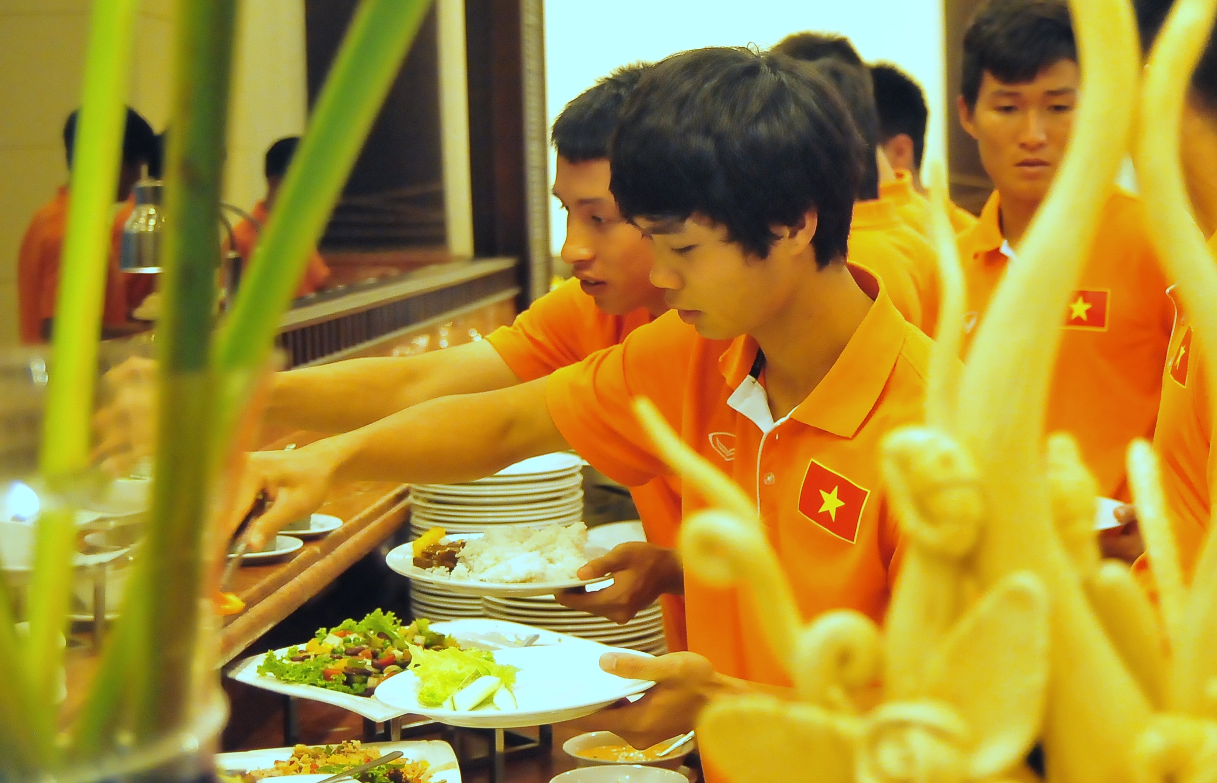 | Dù khách sạn phục vụ rất nhiều món, đĩa cơm của tuyển thủ vẫn "trắng tinh". Đội trưởng Quế Ngọc Hải chia sẻ: "Đồ ăn ở khách sạn có hàng trăm thứ, nhưng tôi và các đồng đội chỉ chọn được 2-3 món có thể cố ăn được. Ban huấn luyện đã tìm cách khắc phục bằng việc mua thêm đồ bên ngoài để bổ sung dinh dưỡng". |