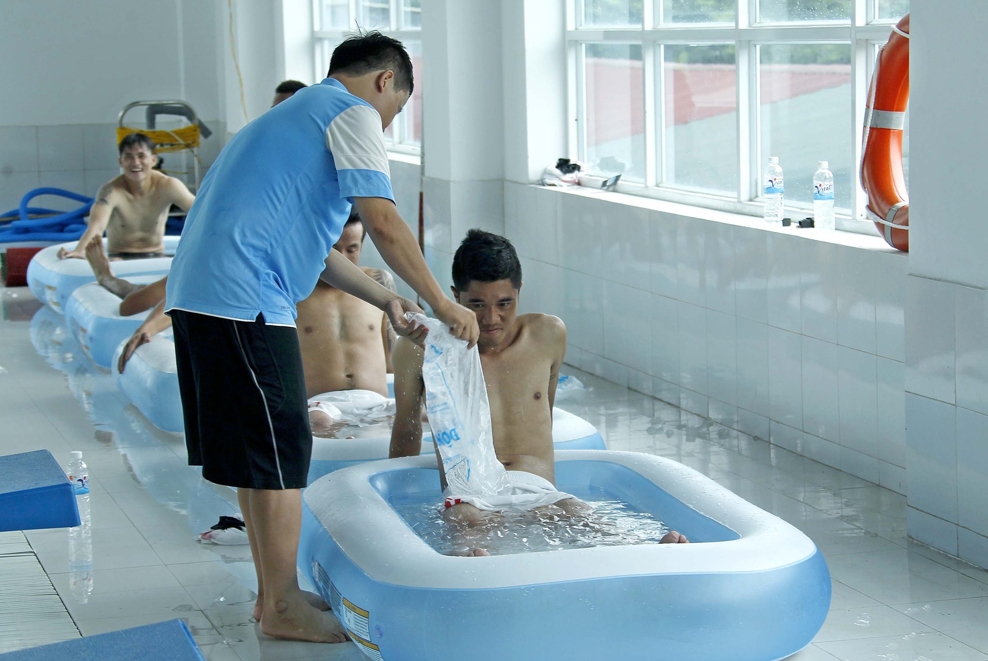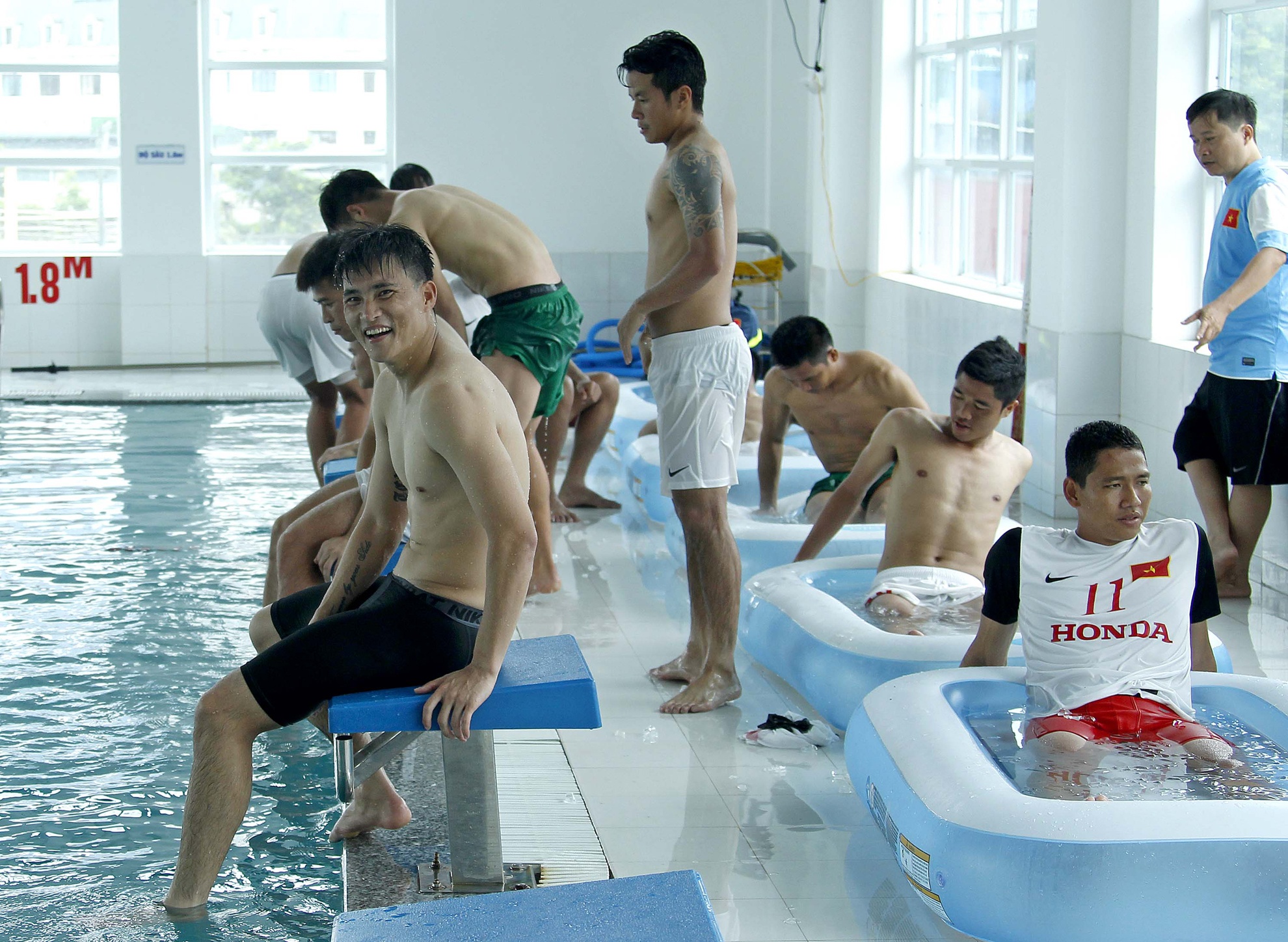 Chiều 29/8, sau buổi tập trong điều kiện thời tiết xấu ở Hà Nội, thày trò HLV Toshiya Miura đã tổ chức đi ngâm người vào nước đá và bơi thư giãn tại khu Liên hợp Thể thao quốc gia.