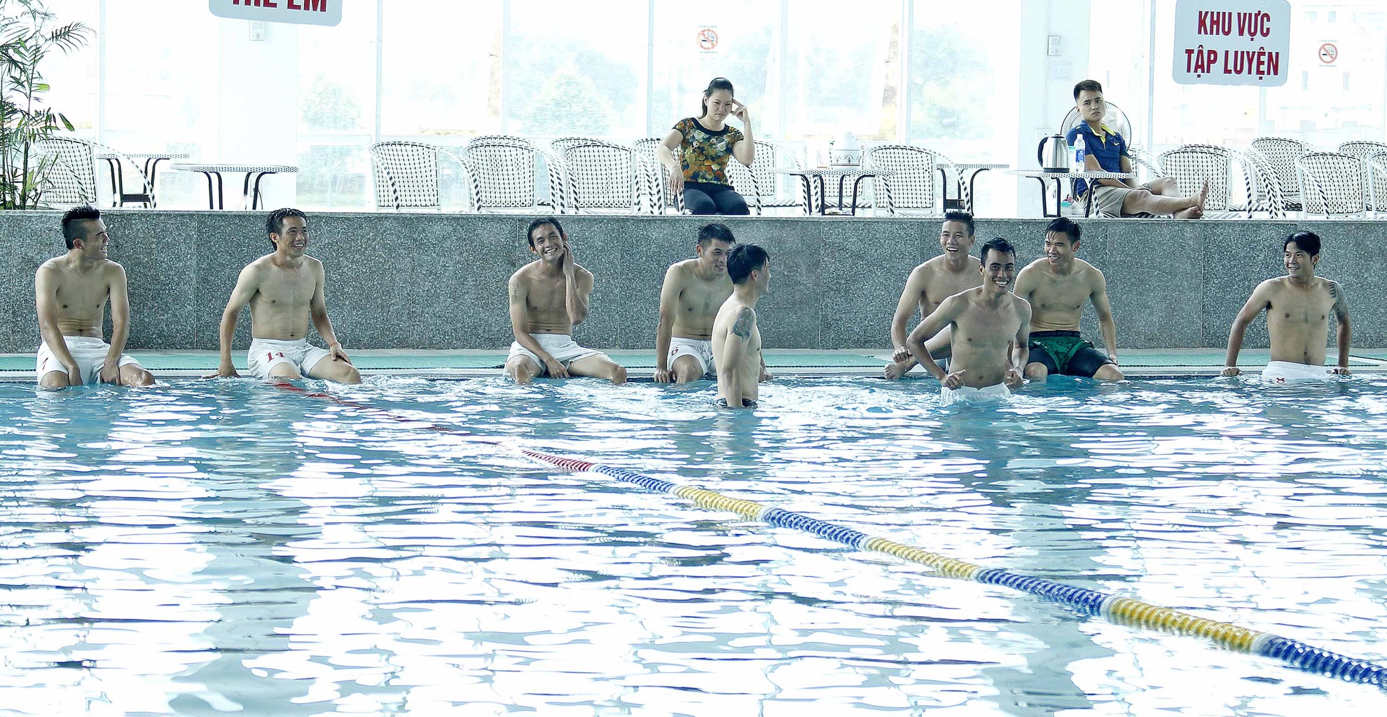 | Tiếp sau đó, toàn bộ 27 tuyển thủ đội dự tuyển quốc gia được dịp xả hơi tại bể bơi. |