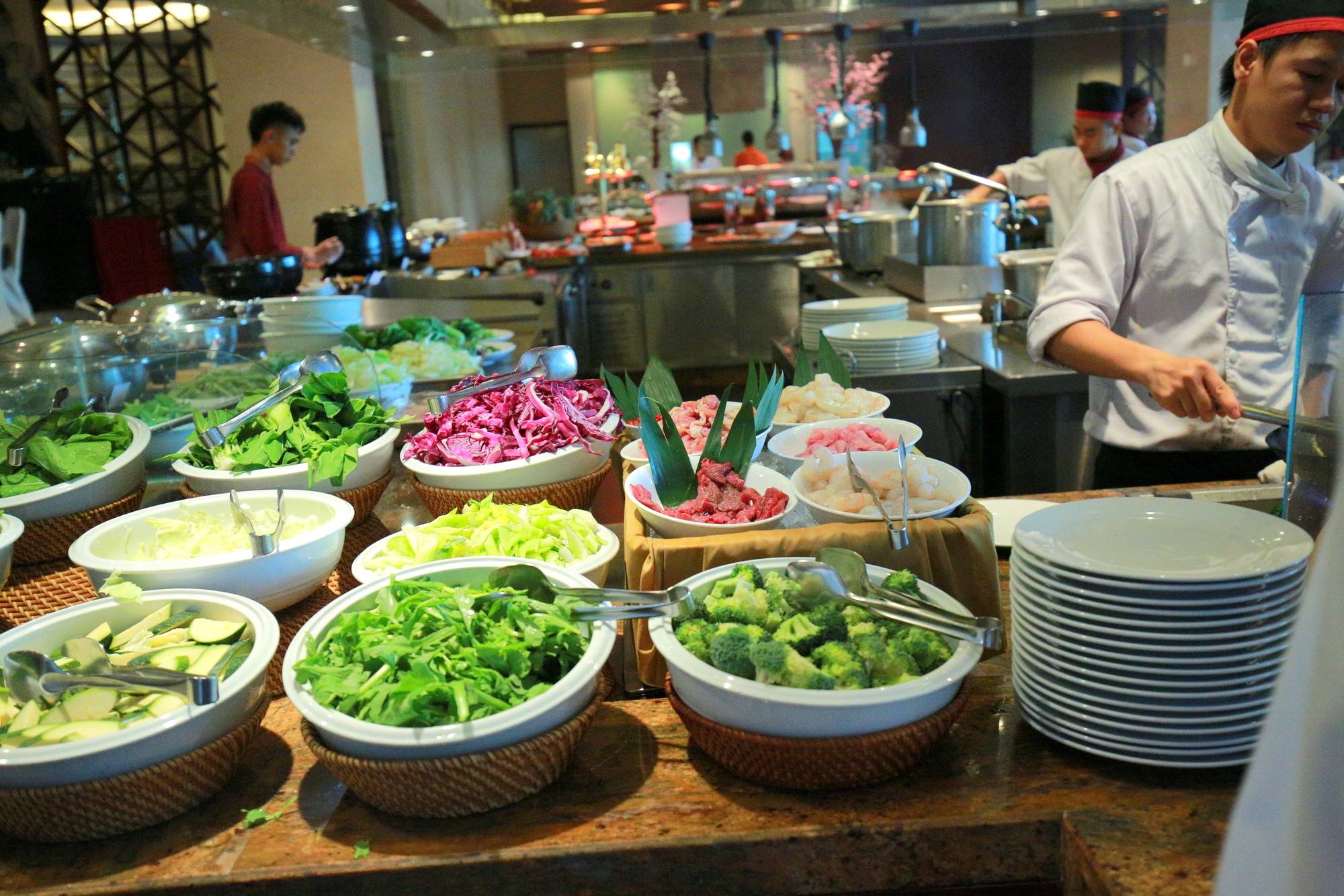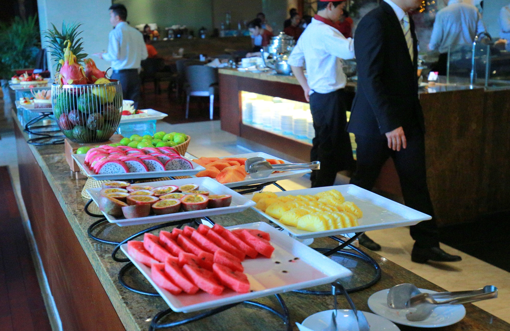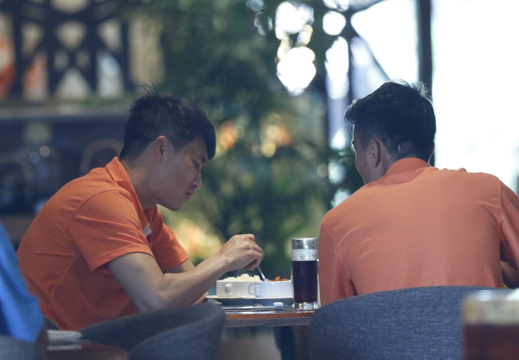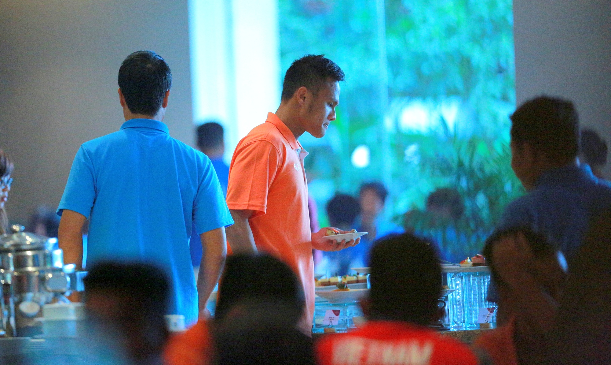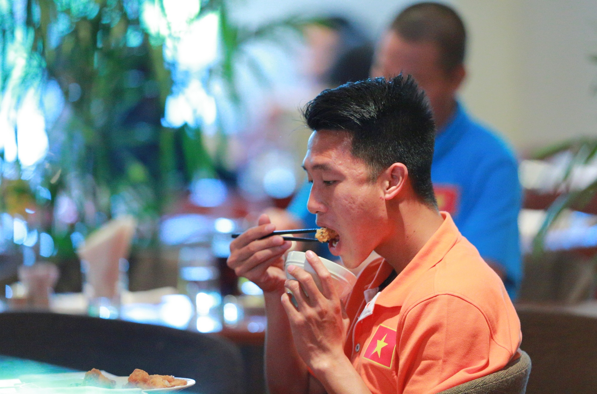 | Tiền vệ Huy Hùng ngon miệng với chế độ ăn buffet tại khách sạn 5 sao. |