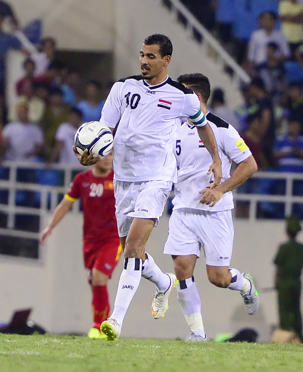 Thủ quân Younis Mahmoud của đội tuyển Iraq tỏ rõ sự thất vọng khi bị đối thủ bị đánh giá thấp hơn chọc thủng lưới trước.