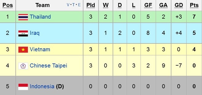 Xếp hạng bảng H sau 3 lượt trận. Việt Nam bỏ lỡ cơ hội qua mặt Iraq để chiếm vị trí thứ hai.