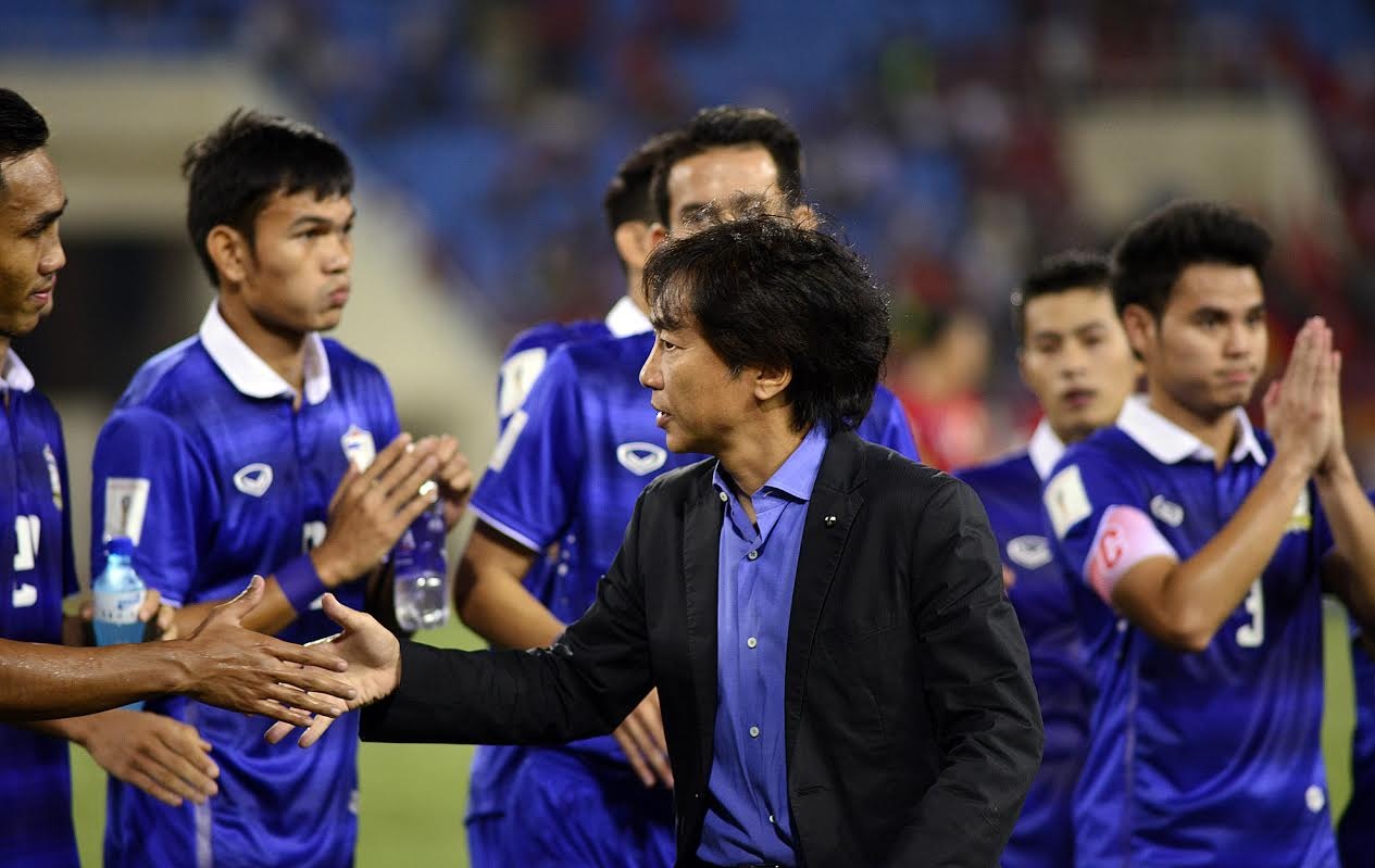 | Huấn luyện viên Miura chúc mừng cầu thủ Thái Lan sau khi trận đấu khép lại. |