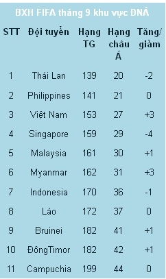 Ở Đông Nam Á, ĐT Thái Lan đã tụt xuống hạng 139 thế giới nhưng vẫn đứng đầu khu vực. Philippines không bị trừ điểm và đứng thứ hai với thứ hạng 141. ĐT Việt Nam tăng ba bậc lên vị trí 153 và vượt Singapore để vươn lên đứng thứ ba khu vực. Singapore (hạng 159) và Malaysia (hạng 160) là hai đội xếp tiếp theo.