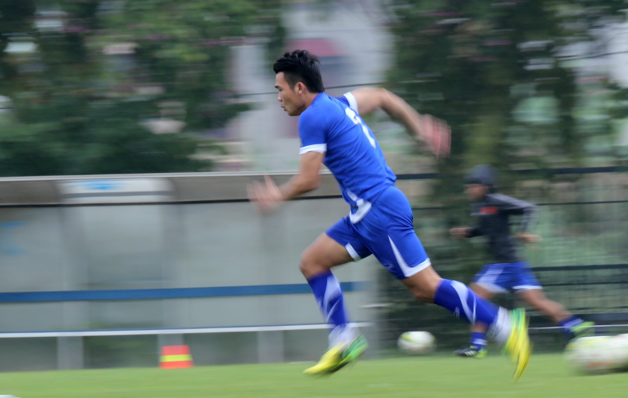 | Hoàng Thịnh nỗ lực bứt tốc trong bài tập của ĐTVN. |