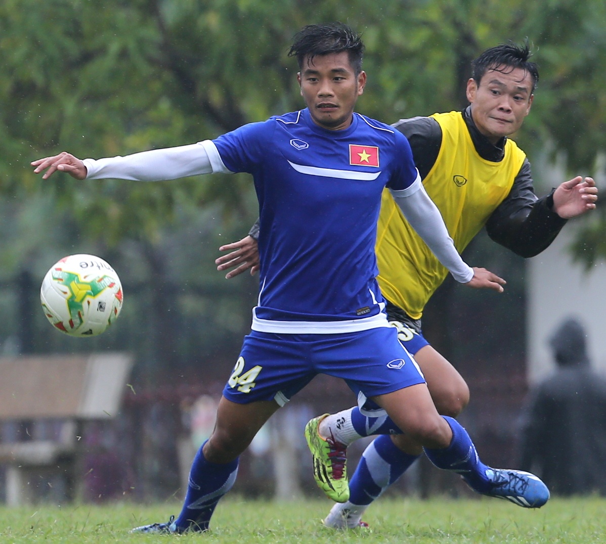 | Trung vệ Minh Tùng đang được HLV Miura thử nghiệm cho đá cặp cùng Tiến Thành trong màn đá đối kháng của ĐTVN. |