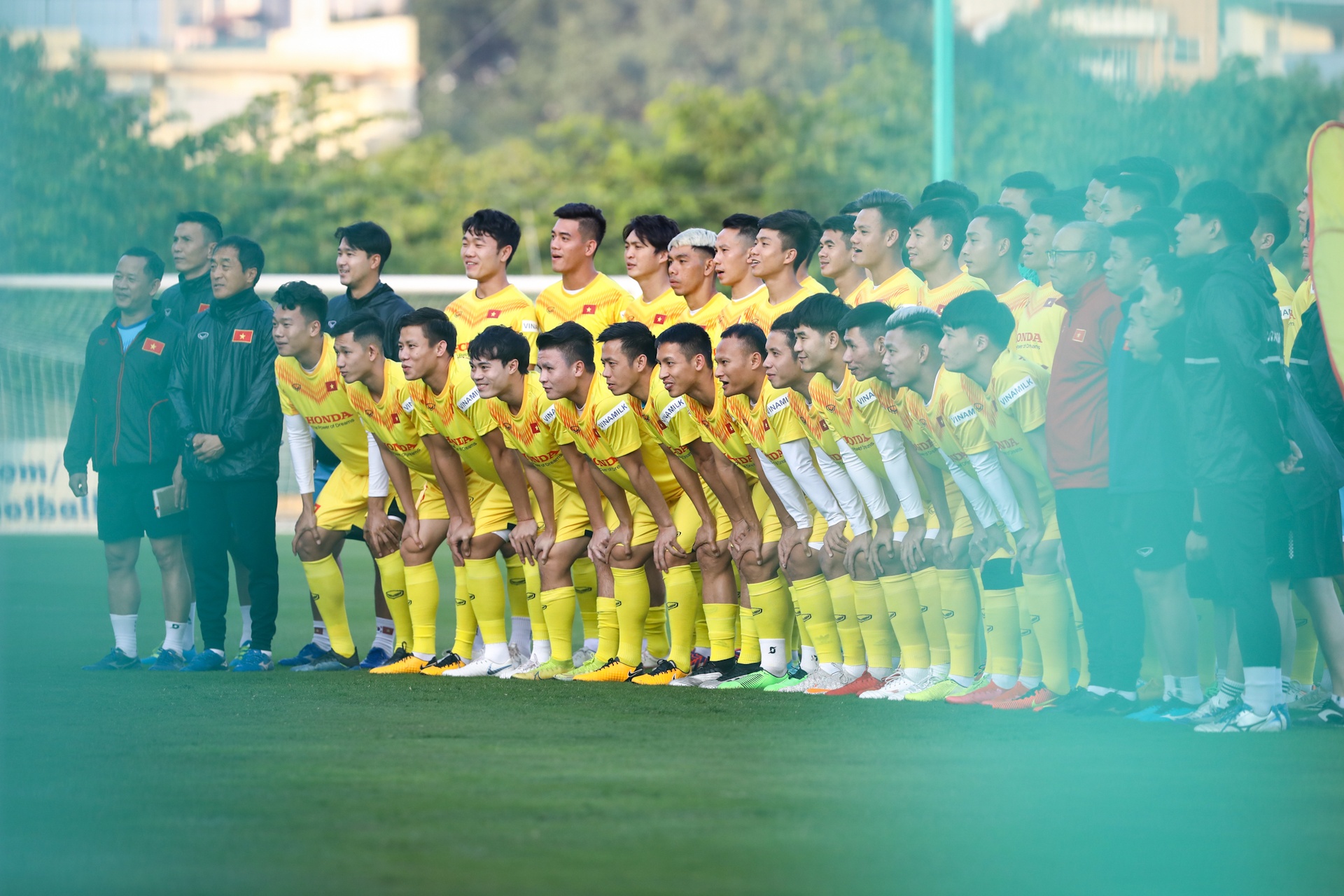| Tuyển Việt Nam chụp hình lưu niệm trong buổi tập chiều 6/12 tại sân Trung tâm Đào tạo Bóng đá trẻ Việt Nam. Lần gần nhất đội tuyển tập trung là hồi tháng 11/2019. Từ đó tới nay, đội tuyển chưa tập trung một lần nào. |