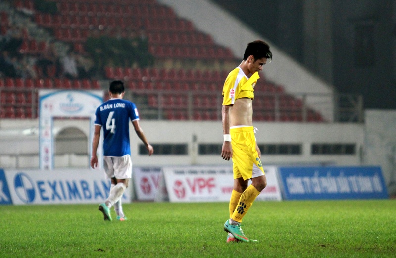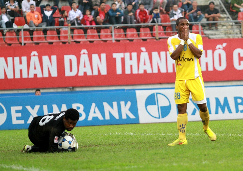 Sau bàn thua, Hải Phòng dâng cao tấn công nhưng các chân sút quá vô duyên. Justie tiếc nuối với một pha đánh đầu cận thành. |