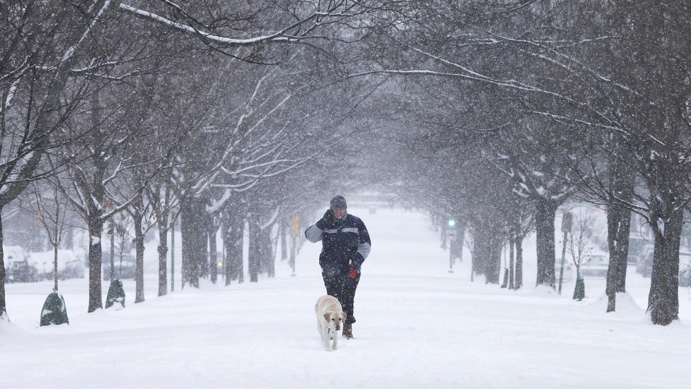 Một người đàn ông dắt chó đi dưới trời tuyết ở thành phố Richmond, bang Virginia. Ảnh: AP |