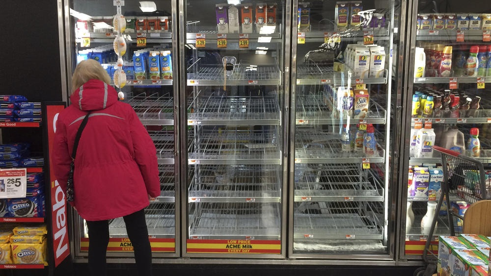Các tủ lạnh sữa tại một cửa hàng thực phẩm ở Philadelphia luôn trong tình trạng hết hàng. Ảnh: AP |