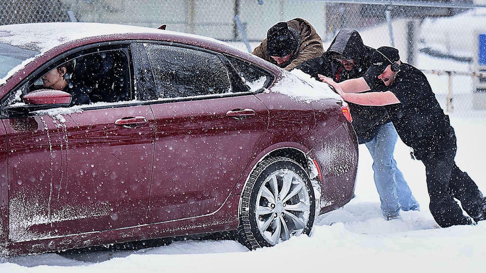 Nhiều người cố gắng đẩy một chiếc xe mắc kẹt trong tuyết ở thành phố Beckley, West Virginia. Ảnh: Register-Herald |
