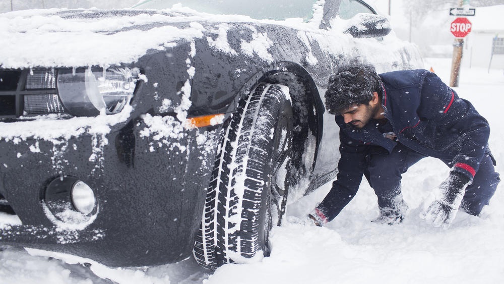 | Chiếc xe của một người đàn ông bị mắc kẹt trong lớp tuyết dày ở