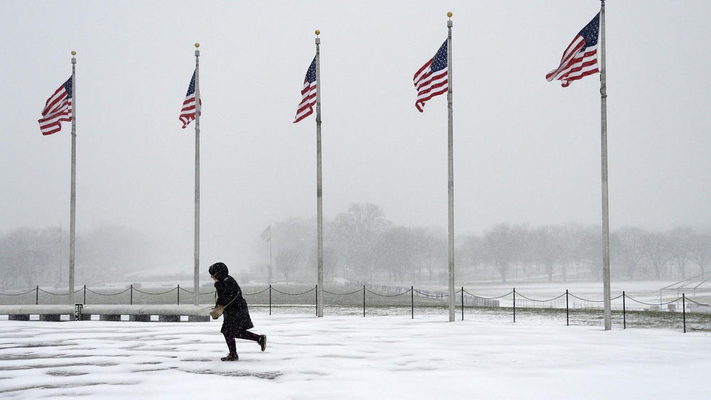 | Một du khách chạy trong tuyết phía trước Đài tưởng niệm Washington. Các trận bão tuyết bắt đầu xảy ra ở Washington vào chiều 22/1. Ảnh: