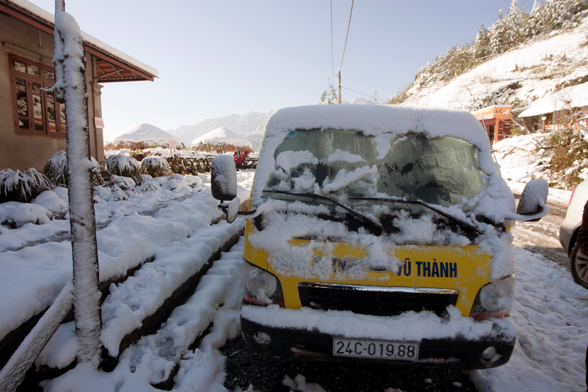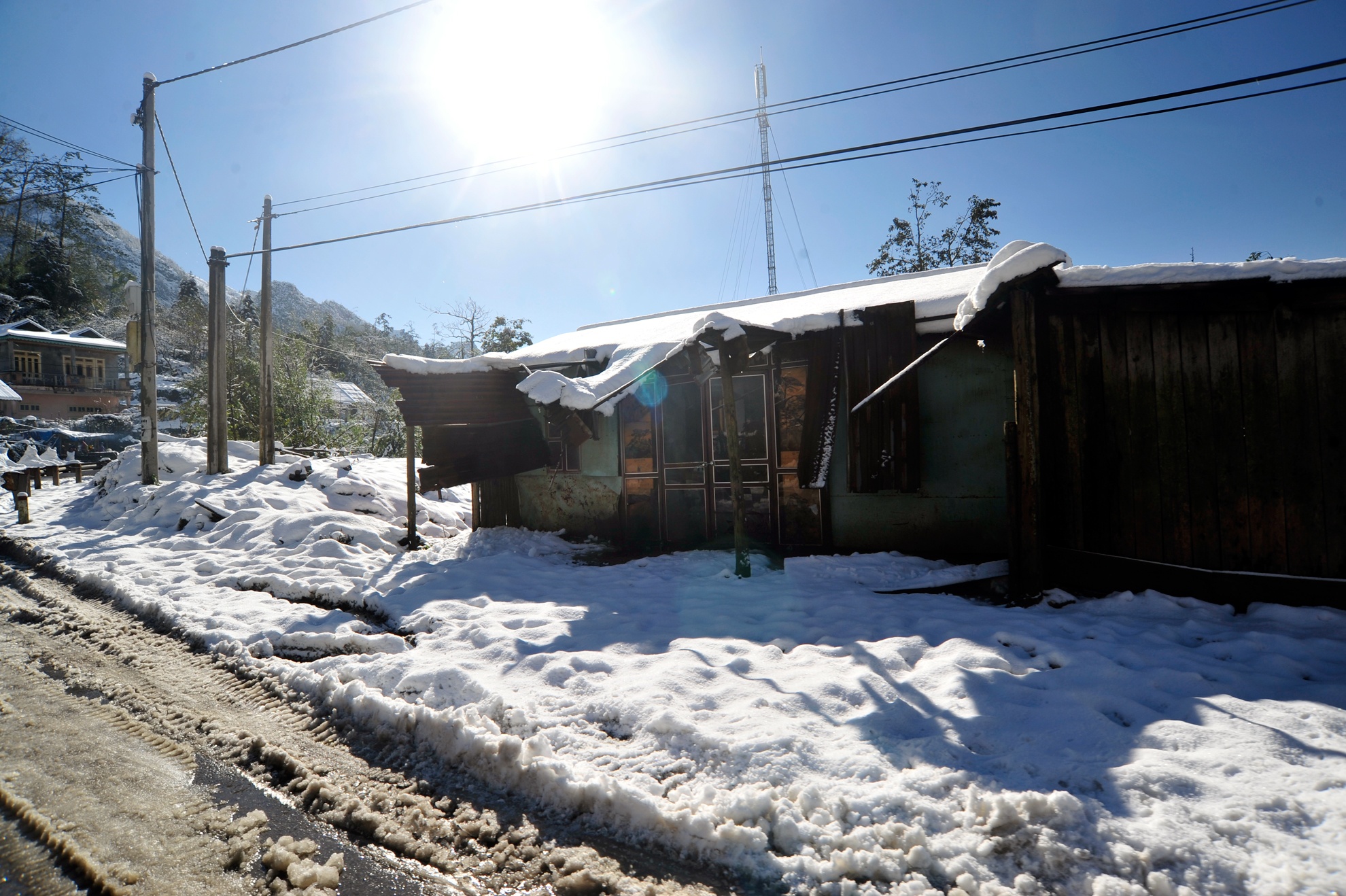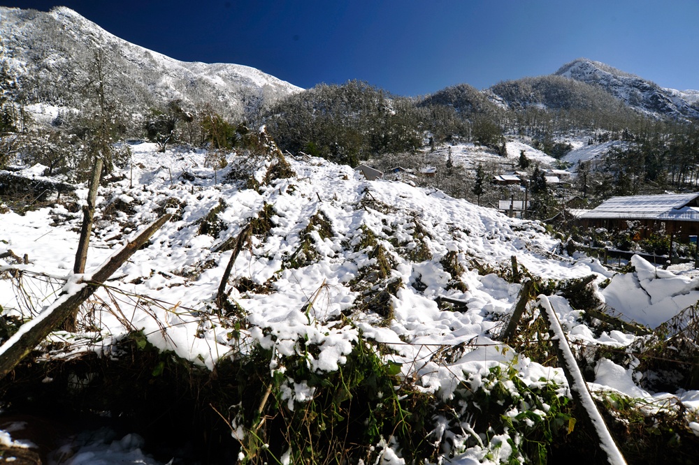 | Tuyết phủ lên mái nhà, đường điện cao thế nên tại xã Sản Xả Hồ bị mất điện gây khó khăn cho người dân trong việc sinh hoạt và nắm bắt thông tin về thời tiết. |