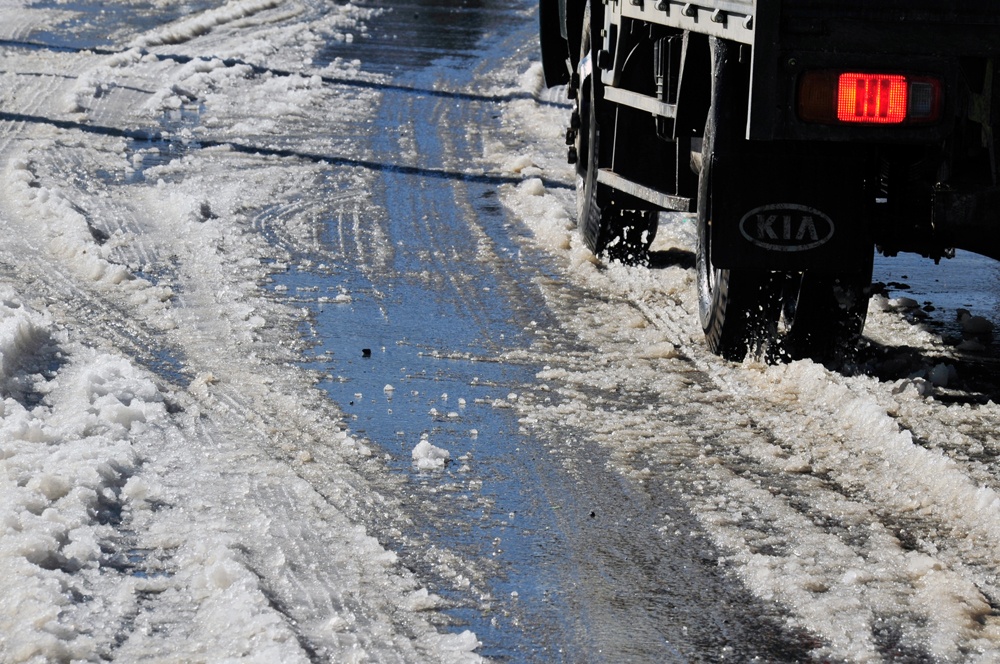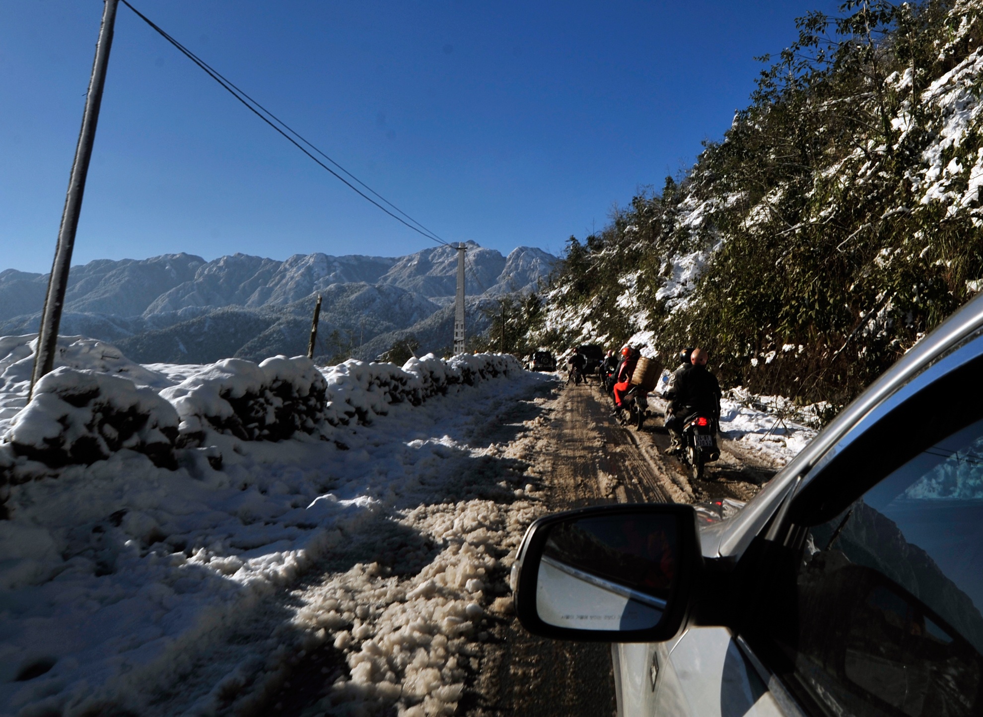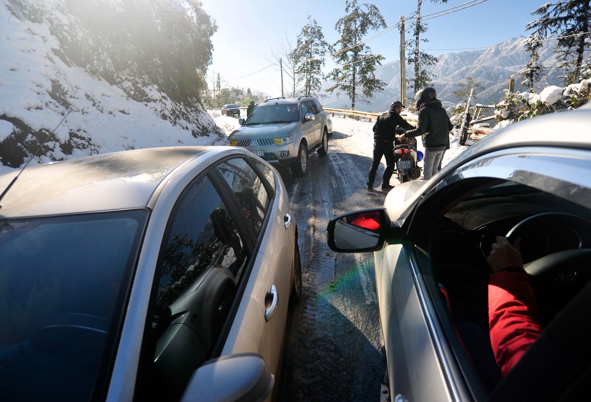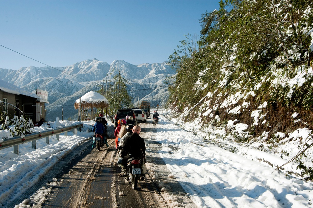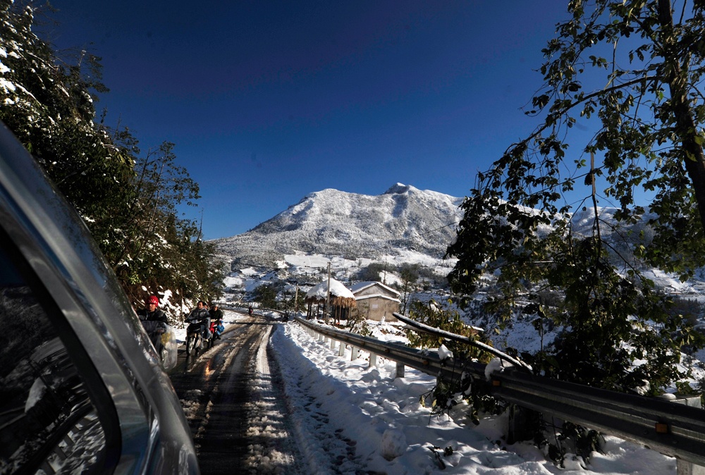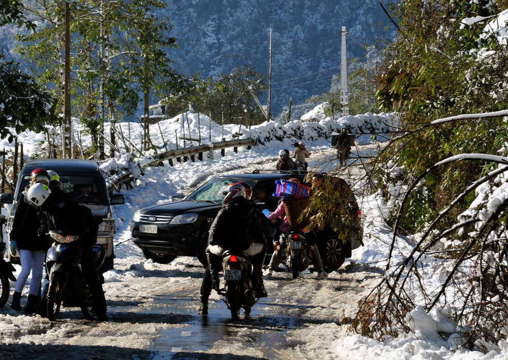 | Tuy băng tuyết bắt đầu tan dần nhưng quãng đường từ thị trấn Sa Pa tới đèo Ô Quý Hồ vẫn khó khăn trong việc di chuyển do lớp băng tuyết dày đóng trên mặt đường gây trơn trượt. |