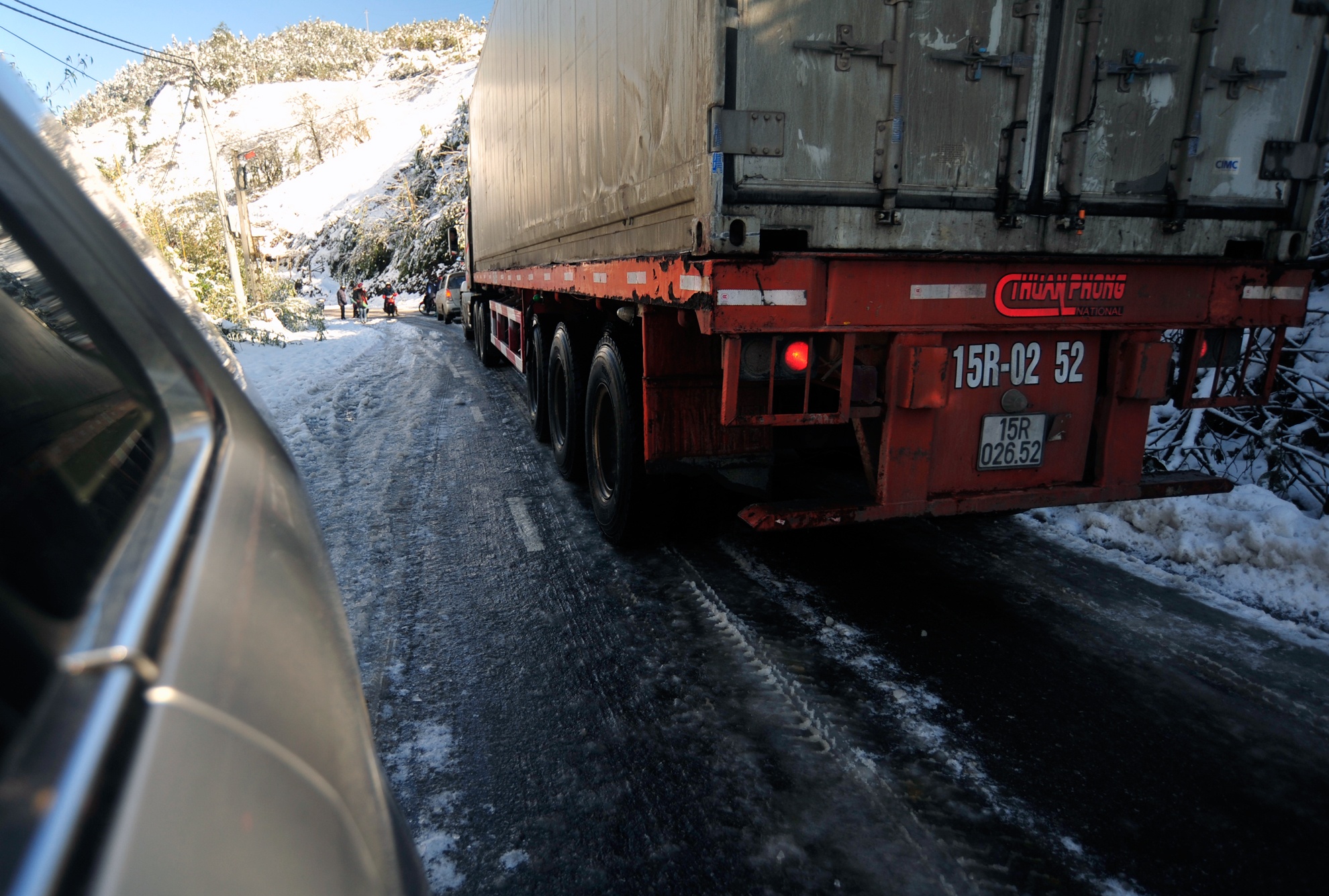 | Đường trơn trượt và 2 xe tránh nhau khá khó khăn. |