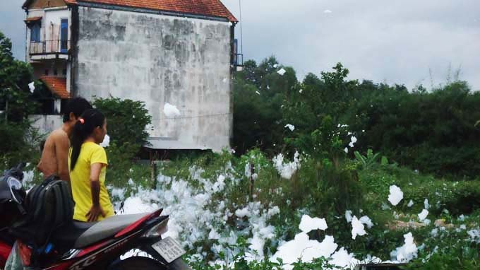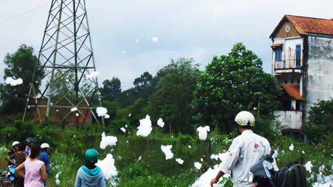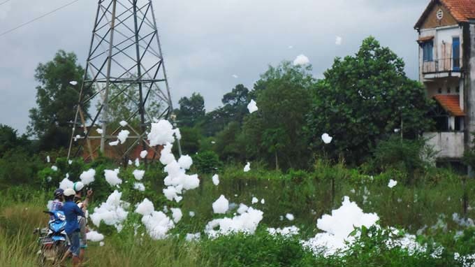 | Theo người dân địa phương nhận định, nước có thể bị ô nhiễm công nghiệp do các công ty xả nước thải và đi theo đường cống. Khi trồi lên mặt đất sinh ra hiện tượng bọt trắng dồn cục thành "tuyết" như vậy. |