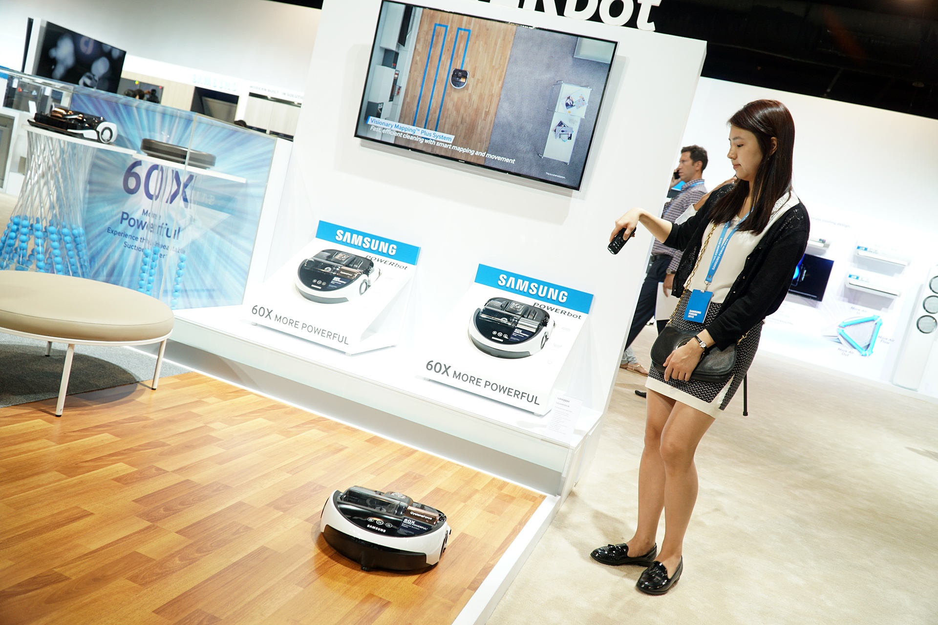 | Samsung cũng mang đến mẫu máy hút bụi mới mang tên Power Robot VR9000. Người dùng có thể điều khiển bằng remote để "dẫn đường" cho chiếc máy hút bụi này len lỏi vào từng ngóc ngách trong căn nhà. |