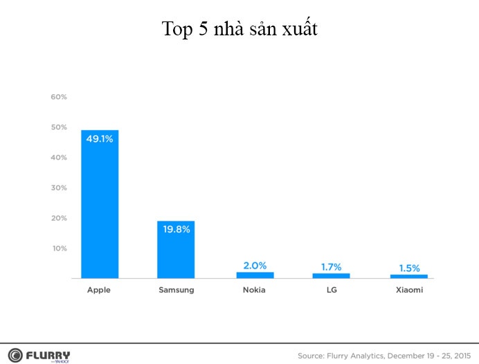 Theo công ty phân tích Flurry, từ 19 đến 25/12 có 49,1% các thiết bị được kích hoạt đến từ Apple, giảm 2% so với cùng kỳ năm ngoái nhưng Táo khuyết vẫn đứng ở vị trí số một.
