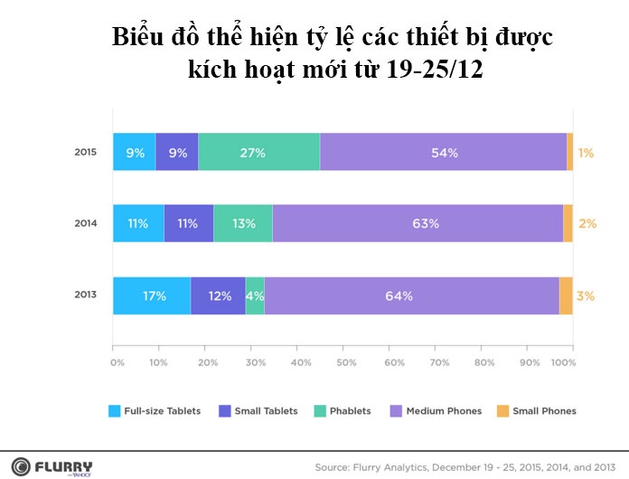 Số liệu cho thấy nhu cầu sở hữu phablet tiếp tục tăng. Trong năm 2013, smartphone có kích thước màn hình lớn được kích hoạt trong khoảng thời gian này chỉ chiếm 4%. Nhưng con số đã tăng lên 13% vào năm ngoái và năm nay là 27%. Smartphone màn hình nhỏ chỉ chiếm 1% và kích thước màn hình trung bình là 54%.