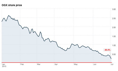 | Tính đến tháng 7/2013, giá trị cổ phiếu của OGX đã bốc hơi hơn 90% so với đầu năm, khiến tài sản của Batista sụt giảm hàng tỷ USD. |