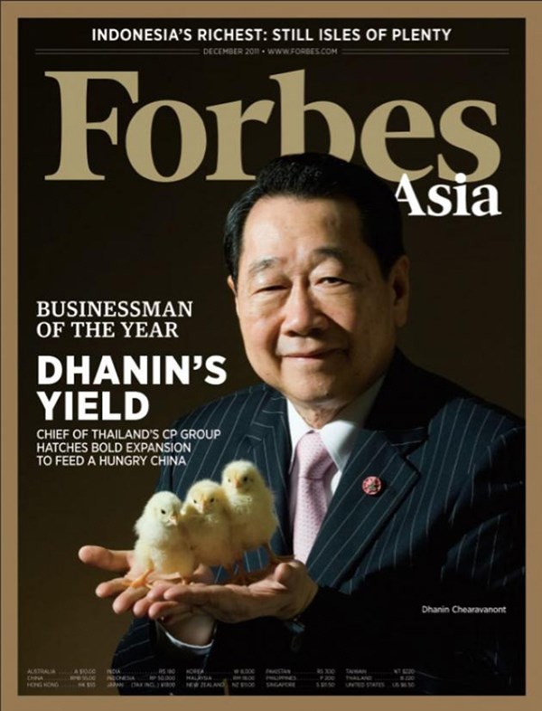 | "Đế chế” CP của tỷ phú Dhanin có mặt trên 17 quốc gia, xuất khẩu sản phẩm sang 40 nước. Trong ảnh là chân dung tỷ phú giàu nhất Thái Lan trên trang bìa của tạp chí danh tiếng Forbes tháng 12/2011. |