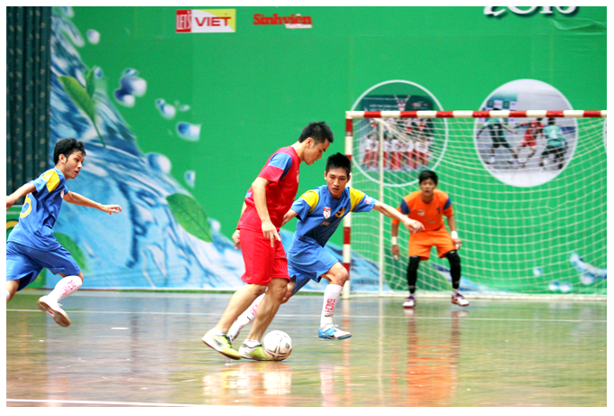 | Trận chung kết toàn quốc đầy kịch tính giữa đội futsa CĐ Bách Việt (màu xanh) và ĐH Phương Đông HN (màu đỏ). |