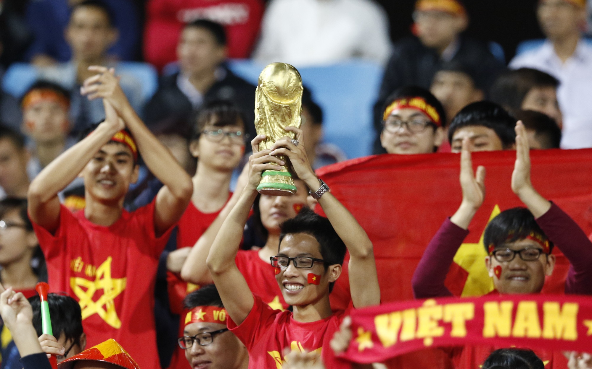 | Chiếc Cup bằng sứ được người hâm mộ mang tới sân cổ vũ ĐTVN thi đấu. |