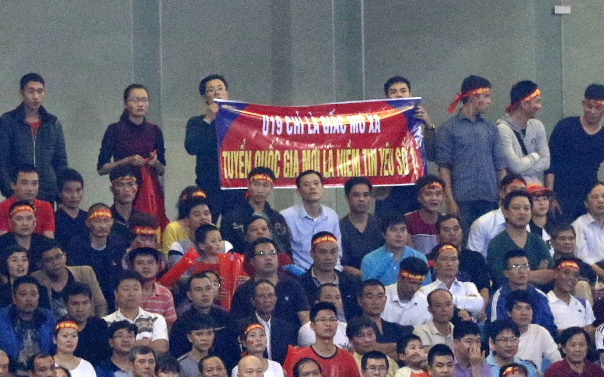 | Bên phía khán đài B (tầng 1) cũng ở tình trạng tương tự, người hâm mộ đến muộn phải chấp nhận đứng ở hành lang hoặc chen giữa lối đi để có thể xem các tuyển thủ Việt Nam thi đấu. |