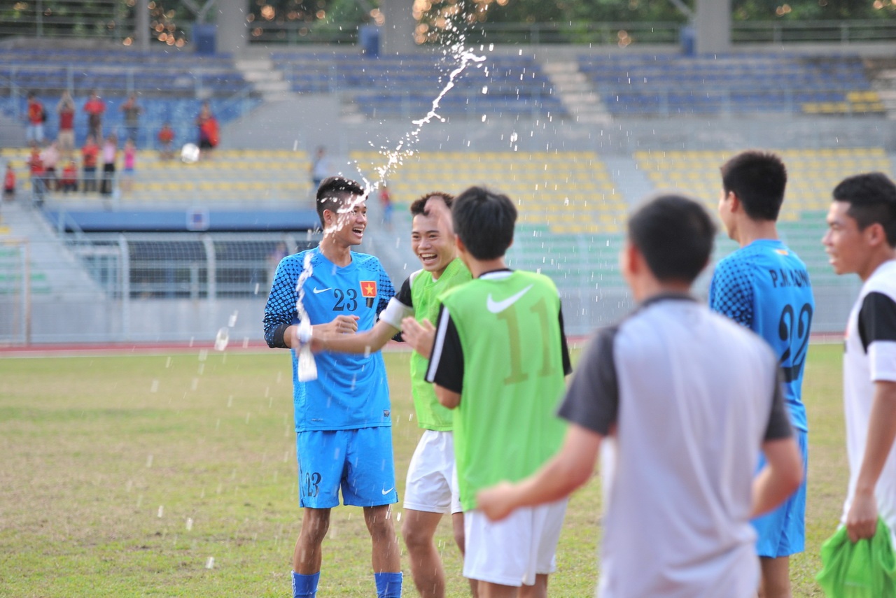 | Văn Toàn ăn mừng bằng cách hắt nước vào các đồng đội. |